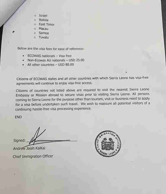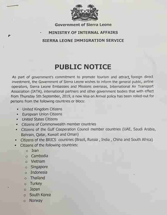 Visa Sierra-Leone / SIERRA LEONE – Le visa peut dorénavant s’obtenir à l’arrivée / SIERRA LEONE – Le visa peut dorénavant s’obtenir à l’arrivée Les autorités sierra-léonaises informent les voyageurs que le visa d’entrée est maintenant délivré à l’arrivée dans le pays. photo: @WikimediaCommons Tweet Publié le 6 Septembre 2019 Le gouvernement de la Sierra Leone a annoncé hier, avec effet immédiat, que les voyageurs souhaitant visiter le pays n’auront plus à se déplacer auprès d’une mission diplomatique avant le départ pour obtenir un visa d’entrée, ce dernier étant dorénavant délivré à l’arrivée. L’état africain avait annoncé au mois de Mars dernier la prochaine évolution de sa politique en matière de visas afin d’attirer plus de touristes dans le pays et ainsi devenir la « nouvelle destination eco-touristique » . C’est par une note provenant du service de l’immigration du Ministère des Affaires Internes, consultable ci-dessous, que le gouvernement annonce la délivrance du visa à l’arrivée dès le 5 Septembre 2019 pour de nombreuses nationalités, notamment les citoyens européens. Le coût du visa délivré à l’arrivée, pour les touristes ou voyageurs d’affaires, s’élève à 80 USD. Prochaine étape: le visa électronique! Tweet Aide à l’obtention du visa ou à la légalisation de documents officiels Assurances rapatriements Visa Afghanistan / Visa Afrique du Sud / Visa Algérie / Visa Angola / Visa Arabie-Saoudite / e-Visitor Australie / Visa Azerbaïdjan / e-Visa Azerbaïdjan / Visa Bahreïn / Visa Bangladesh / e-Visa Bénin / Visa Biélorussie / Visa Brésil / Visa Burkina-Faso / Visa Burundi / Visa Cambodge / Visa Cameroun / Visa Cap-Vert / Visa Canada / Visa Centrafrique / Visa Chine / Visa Congo (Brazzaville) / Visa Côte d’Ivoire / Visa Cuba / Carte touristique Cuba / Visa Djibouti / Visa Egypte / Visa Érythrée / Visa Etats-Unis / e-Visa Ethiopie / Visa Gabon / Visa Gambie / Visa Ghana / Visa Guinée-Bissau / Visa Guinée-Equatoriale/ Visa Inde / e-Visa Inde / Visa Indonésie / Visa Irak / Visa Iran / Visa Iran à l’arrivée / Visa Jordanie / Visa Kazakhstan / Visa Kenya / Visa Laos / Visa Liban / Visa Liberia / Visa Madagascar / Visa Malawi / Visa Mali / Visa Mauritanie / Visa Mongolie / Visa Mozambique / Visa Myanmar / e-Visa Myanmar / Visa Népal / Visa Niger / Visa Nigeria / Visa Oman / e-Visa Oman / e-Visa Ouganda / Visa Ouzbékistan / e-Visa Ouzbékistan / Visa Pakistan / Visa Philippines / Visa Russie / Visa Rwanda / Visa Sao-Tomé-et-Principe / Visa Sierra-Leone / Visa Soudan / Visa Sri-Lanka / ETA Sri-Lanka / Visa Syrie / Visa Tadjikistan / e-Visa Tadjikistan / Visa Taiwan / Visa Tanzanie / Visa Tchad / Visa Thaïlande / Visa Togo / Visa Turkménistan / Visa Vietnam / e-Visa Vietnam / Visa Vietnam à l’arrivée / Visa Yémen / Visa Zambie / Visa Zimbabwe 06/09/2019 - SIERRA LEONE – Le visa peut dorénavant s’obtenir à l’arrivée12/03/2019 - SIERRA LEONE – Visa à l’arrivée et e-Visa en préparation